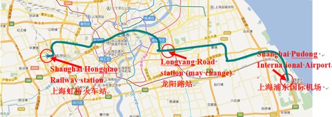 Step 1: Pudong Airport(浦东机场) to Hongqiao (railway) station(虹桥ç«è½¦ç«™ï¼‰ by metro line 2 (in color green), from station - Shanghai Pudong Airport to Hongqiao (Metro) station. Beware, sometimes, the train will stop at Longyang road station, you may change to a new train (but still the same metro line 2) in Longyang road station(龙阳路站). If you want to save your time, you may take the MagLev Trainï¼ˆç£æ‚¬æµ®ï¼‰ from Pudong Airport to Longyang road station, and take metro line 2 at Longyang road station, get off at Hongqiao (railway) station.